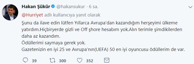 “Şunu da ilave edin lütfen Yıllarca Avrupa’dan kazandığım herşeyimi ülkeme yatırdım.Hiçbiryerde gizli ve Off şhore hesabım yok.Alın terimle şimdikilerden daha az kazandım. Ödüllerimi saymaya gerek yok. Gazetenizin en iyi 25 ve Avrupa’nın(UEFA) 50 en iyi oyuncusu ödüllerim de var.”