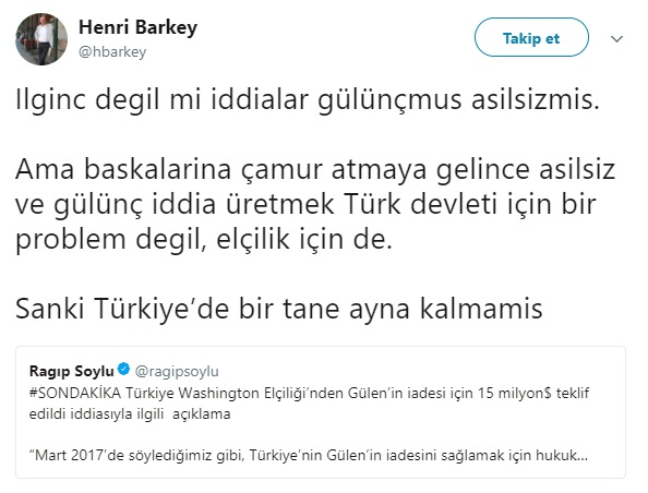 15 Temmuz darbe girişiminin ‘uluslararası ayağı’ olduğu iddiasıyla Ortadoğu uzmanı ve akademisyen Henri Barkey’e yakalama kararı çıkarıldı. Barkey CIA uzmanı olarak biliniyor. Twitter hesabından iddialara cevap veren Barkey, Türkiye Washington Elçiliği’nin Gülen’in kaçırılması için 15 milyon dolar verildiği iddisına ‘gülünç’ açıklaması yapmasını hatırlatarak, “İlginç değil mi iddialar gülünçmüş asılsızmış. Am başkalarına çamur atmaya gelince asılsiz ve gülünç iddialar üretmek Türk devleti için bir problem değil, elçilik için de. Sanki Türkiye’de bir tane ayna kalmamış.” dedi.