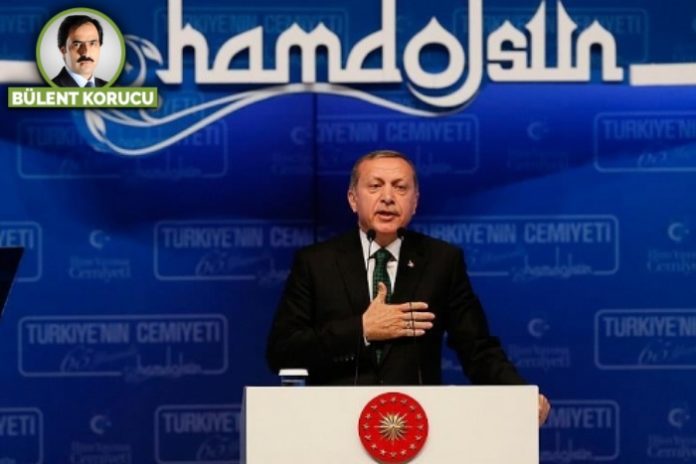 Cumhurbaşkanı ve AKP Genel Başkanı Erdoğan dini terminolojiyi en fazla ama aynı zamanda en yanlış kullanan siyasetçilerden. Bir Tansu Çiller vardı, ‘Cenabı Allah’ı halka emanet eden’; lakin onunki gerçekten bilgisizlik ve dil sürçmesiydi. Erdoğan bazen işin cılkını çıkaracak şekilde bilinçli yapıyor, bazen de şuur altının dışa vurumu sırasında yakalanıyor.