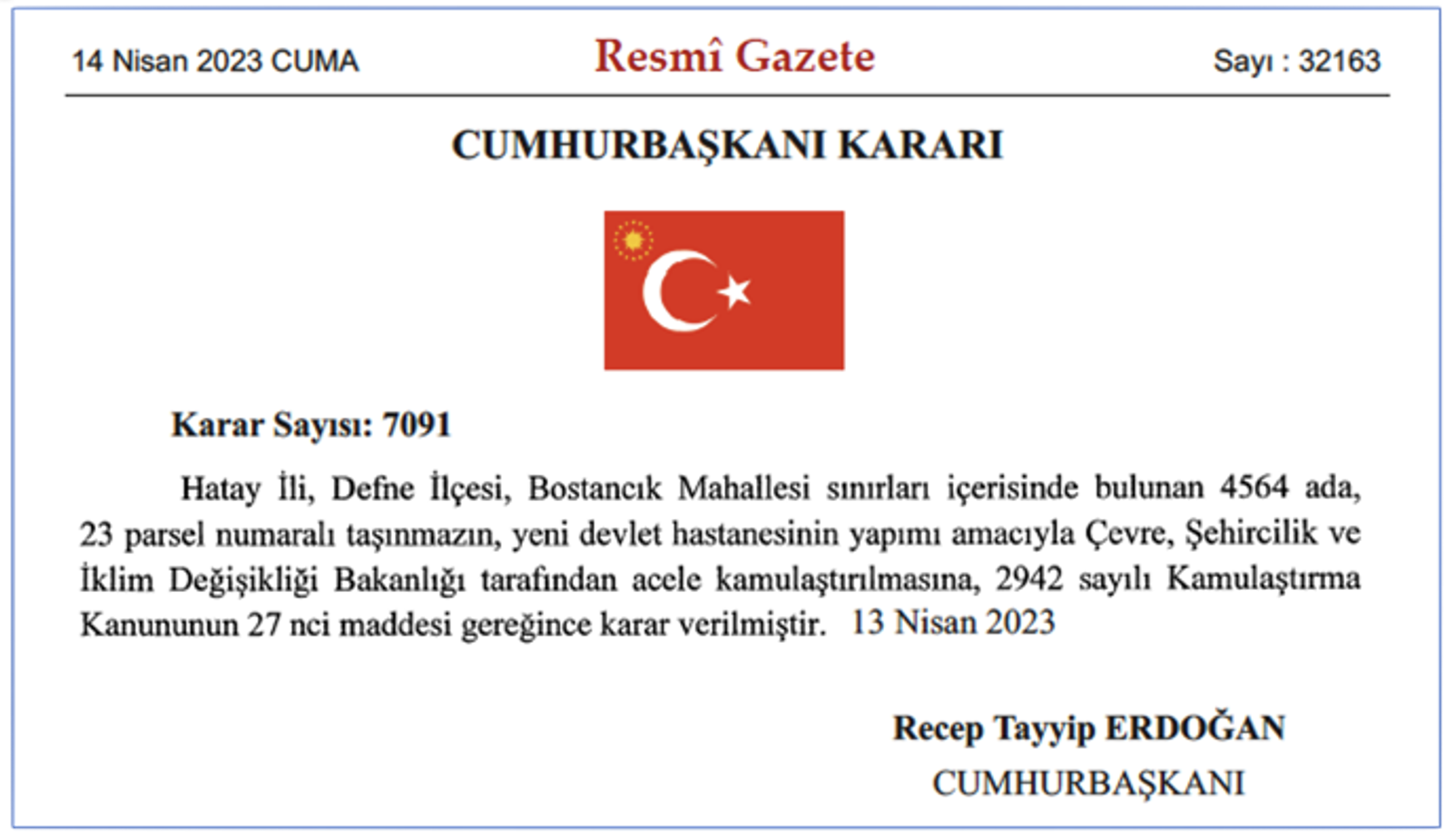 Hatay’da AKP’li Cumhurbaşkanı Tayyip Erdoğan tarafından temeli göstermelik olarak atılan Devlet Hastanesi projesine ilişkin kamulaştırma kararının 14 Nisan’da alındığı ortaya çıktı.