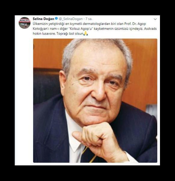 Profesör Agop Kotoğyan’ın öldüğünü CHP İstanbul Milletvekili Selina Doğan, kişisel Twitter hesabından duyurdu. Doğan, “Ülkemizin yetiştirdiği en kıymetli dermatologlardan biri olan Prof. Dr. Agop Kotoğyan’ı nam-ı diğer ‘Kolsuz Agop’u’ kaybetmenin üzüntüsü içindeyiz. Asdvads hokin lusavore. Toprağı bol olsun” diye belirtti.