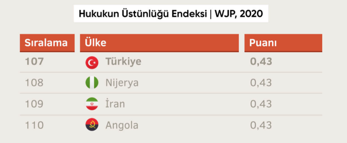 Hukukun Üstünlüğü Endeksi 2020 raporunda 128 ülke arasında Türkiye 107. sıraya düşmüş. Son 7 yılda istikrarlı bir şekilde listenin dibine doğru ilerlemesi de kendisinin “onurlu hakimleri” sayesinde olmuş.