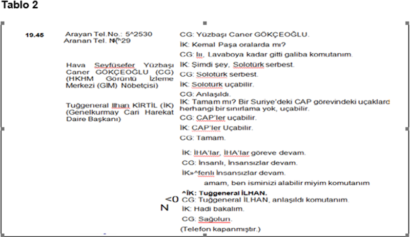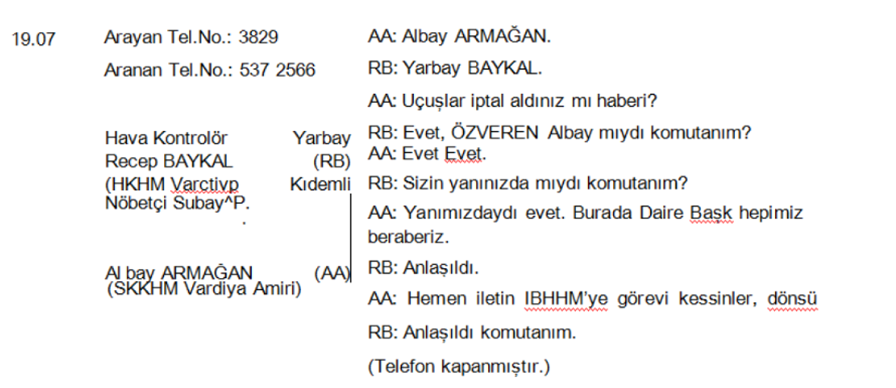 Akar bu emri saat 18.50’de veriyor: “Havada bulunan tüm askeri araçlar indirilsin” deniyor ve Türkiye’nin tüm askeri sahası kapatılıyor. Akar’ın emri üzerine Silahlı Kuvvetler Komuta Harekât Merkezinden (SKKHM) bir Albay 19.07’de Hava Kuvvetleri Harekât Merkezinden bir Yarbaya bu yasağı telefonla iletiyor.
