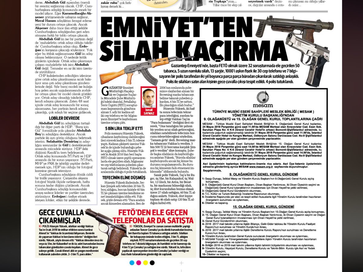 Haberde soruşturmalar kapsamında gözaltına alınan S. adlı bir kadına ait iki cep telefonu ve bir bilgisayarın emniyette kaybolması üzerine başlıyor. Fakat bunu ek olarak habere 32 soruşturmada ele geçirilen ve Cemaat ile ilişkisi olmayan 50 tabanca, 5 uzun namlulu silah, 13 şarjör, 1000’i aşkın fişek ile 30 cep telefonu ve 7 bilgisayarın bir polis tarafından iki yıl boyunca parça parça bürodan çıkarılarak satıldığı bilgisi ekleniyor. Gerek haber dilinde gerek gazetenin mizanpajında silahların Gülen Hareketi mensuplarından çıktığı algısı oluşturuldu.