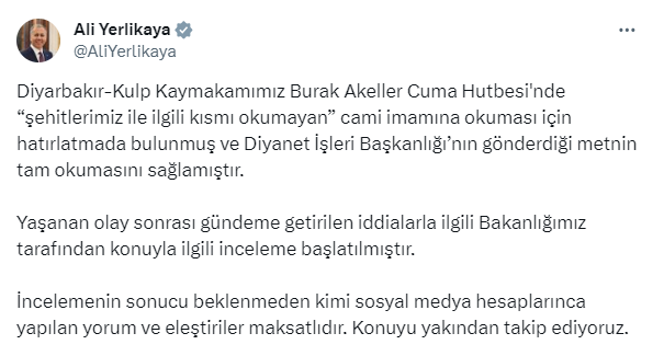 Diyarbakır’ın Kulp ilçesinin kaymakamı Burak Akeller, Cuma namazı için gittiği Bahçelievler Camii’nde imamın hutbede, şehitlerle ilgili kısmı atladığını fark ediyor. Cep telefonundan Diyanet’in hutbeleri yayınladığı adrese girip kontrol ediyor ve daha imam minberde iken müdahale ediyor. Hutbesini bitirip inmeye hazırlanan imam da atladığı bölümün bir kısmını okuyarak hutbesini tamamlayıp namazı kıldırıyor.