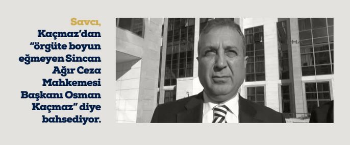 Bir de Osman Kaçmaz olayı var. Buna özel değinmek lazım. Savcı, Kaçmaz’dan “örgüte boyun eğmeyen Sincan Ağır Ceza Mahkemesi Başkanı Osman Kaçmaz” diye bahsediyor. Allah Allah. Bakalım Hakim Kaçmaz kimmiş, hatırlayalım. Dönemin cumhurbaşkanı Abdullah Gül’ün ‘Kayıp Trilyon’, dönemin başbakanı Erdoğan’ın da ‘Şehit ve kelle’ davasından yargılanmasına karar veren Sincan Hakimi Osman Kaçmaz kendi yazdığı kitapta bakın neler diyor: