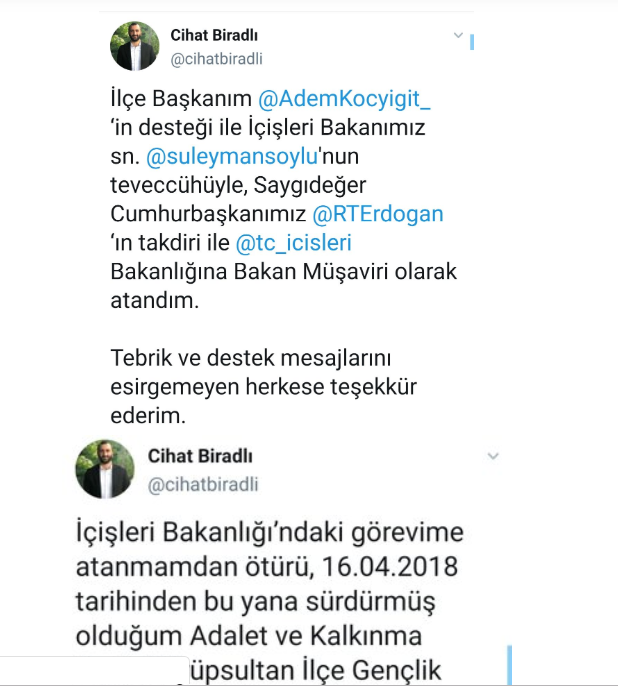 AKP İstanbul Eyüp İlçe Gençlik Kolları Başkanı Cihat Biradlı İçişleri Bakanlığı’na müşavir olarak atandı. Biradlı sınavsız ve mülakatsız atamanın ardından ilçe başkanına, İçişleri Bakanı Süleyman Soylu’ya ve AKP’li Cumhurbaşkanı Tayyip Erdoğan’a teşekkür etti.