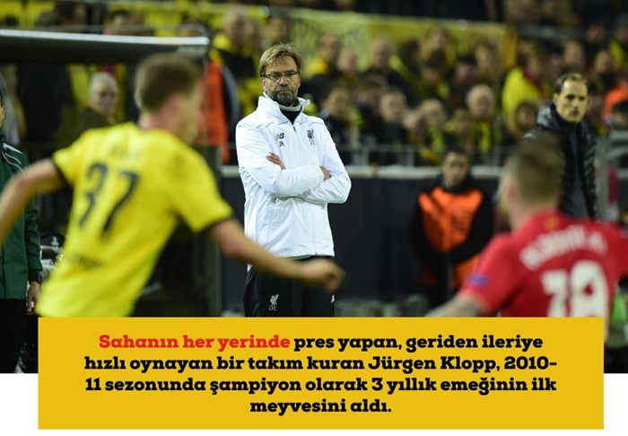Klopp, “Yıldız maçı kazandırır, takım oyunu şampiyonluğu getirir” prensibiyle adı sanı duyulmamış gençlerden oluşan bir ekip kurmak için harekete geçti. Sahanın her yerinde pres yapan, geriden ileriye hızlı oynayan bir takım kuran Klopp, 2010-11 sezonunda şampiyon olarak 3 yıllık emeğinin ilk meyvesini aldı. 24,3’lük yaş ortalamasıyla Klopp’un takımı Bundesliga tarihinin en genç şampiyonu oldu. Klopp’un öğrencileri, 2011-12 sezonunu da şampiyon tamamlayıp başarılarının tesadüfî olmadığını gösterdi.