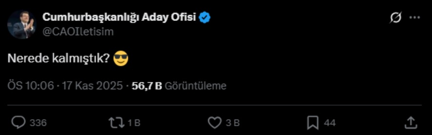 İmamoğlu’nun kapatılan hesabı ardından yeni hesap açıldı. Yeni hesaptan “Nerede kalmıştık?” mesajı paylaşıldı.