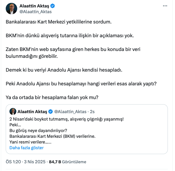 Ekonom yazarı Alaattin Aktaş da konuyla ilgili iki ayrı paylaşım yaptı. Şunları yazdı: