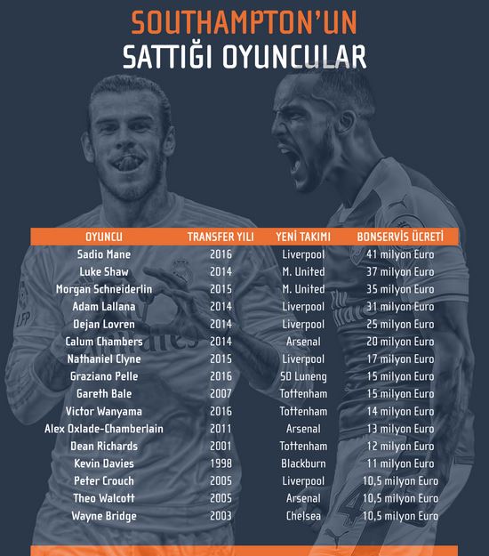 Theo Walcott, Gareth Bale, Alex Oxlade-Chamberlain, Rickie Lambert, Luke Shaw, Adam Lallana, Dejan Lovren, Calum Chambers, Nathaniel Clyne, Morgan Schneiderlin, Graziano Pelle, Victor Wanyama, Sadio Mane, Jose Fonte… Bu uzun isim listesinin ortak özelliği, yıldızlarını Southampton FC takımında parlatıp, astronomik ücretlerle Avrupa’nın önde gelen kulüplerine transfer olmaları.