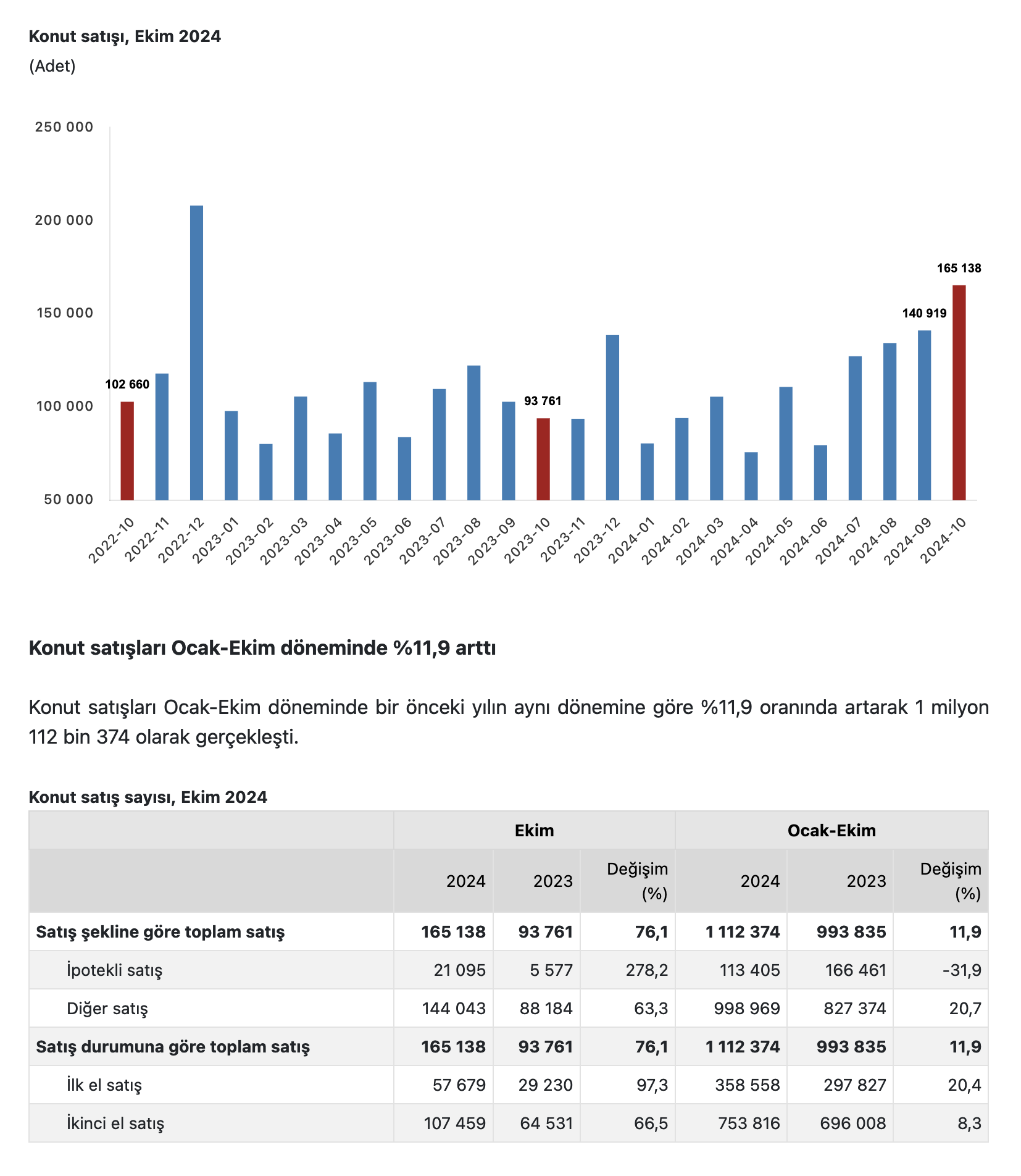 TÜİK’in istatistiklerine göre Türkiye genelinde konut satışları ekim ayında bir önceki yılın aynı ayına göre yüzde 76,1 oranında artarak 165 bin 138 oldu. İpotekli konut satışları ekim ayında bir önceki yılın aynı ayına göre yüzde 278,2 oranında artarak 21 bin 95 oarak kayda geçti.