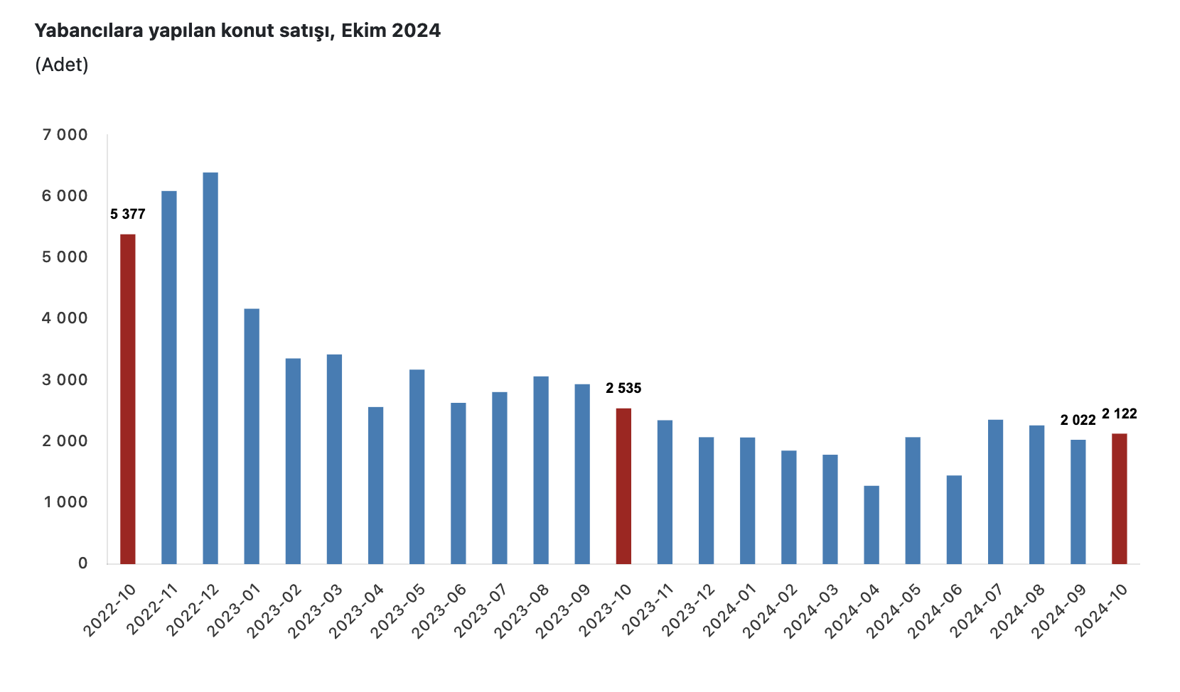 Yabancılara yapılan konut satışları Ekim ayında bir önceki yılın aynı ayına göre yüzde 16,3 oranında azalarak 2 bin 122 oldu. Ekim ayında toplam konut satışları içinde yabancılara yapılan konut satışının payı yüzde 1,3 olarak gerçekleşti. Yabancılara yapılan konut satış sayısının en fazla olduğu iller sırasıyla 750 ile Antalya, 724 ile İstanbul ve 148 ile Mersin oldu. Yabancılara yapılan konut satışları ocak-ekim döneminde bir önceki yılın aynı dönemine göre yüzde 37,2 oranında azalarak 19 bin 212 oldu. Ekim ayında ülke uyruklarına göre en fazla konut satışı sırasıyla 373 ile Rusya Federasyonu, 172 ile İran ve 136 ile Ukrayna vatandaşlarına yapıldı.