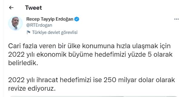 “Cari fazla veren bir ülke konumuna hızla ulaşmak için 2022 yılı ekonomik büyüme hedefimizi yüzde 5 olarak belirledik. 2022 yılı ihracat hedefimizi ise 250 milyar dolar olarak revize ediyoruz.”