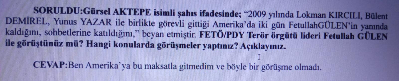 Emniyet görevlileri Kırcılı’ya, işkence ile ifadesi alınan eski İstihbarat Dairesi Başkan Yardımcısı Gürsel Aktepe’ye ait olduğu iddia edilen bilgileri yöneltiyor. Aktepe emniyette ve savcılıkta kabul ettiği ancak mahkeme aşamasında reddettiği ifadesinde, istihbaratta cemaatin yapılanması olduğu, Kırcılı’nın da cemaatin önemli elemanlarından biri olduğu ve 15 Temmuz darbe girişiminden önce kendilerine özel bir mesaj geldiğinden dolayı istihbarat dairesine Lokman Kırcılı ile birlikte gittikleri yönünde bilgiler paylaşmıştı. Ancak Kırcılı, Aktepe’ye ait olduğu iddia edilen bütün ifade bilgileri net bir şekilde yalanlıyor.