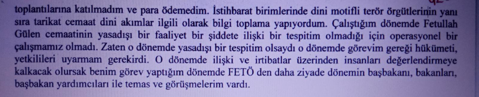 Kırcılı ifadesinde ayrıca hiçbir grup ya da örgüte katılmadığını, bu yapılara para ya da herhangi bir aidatta ödemediğini aktarıyor. Kendisinin yıllarca İDB’nda görev yaptığı dönemde dini motifli terör örgütlerinin yanı sıra, tarikat, cemaat ve birçok dini akımlar ilgili çalışmalar yaptığını kaydeden Kırcılı, şunları anlatıyor: “Çalıştığım dönemde Fethullah Gülen cemaatinin yasadışı bir faaliyet ve şiddetine ilişkin bir tespit olmadığı için operasyonel bir çalışmamız olmadı. Zaten o dönemde yasadışı bir tespitim olsaydı o dönemde görevim gereği hükümet yetkilileri uyarmam gerekirdi. O dönemde ilişki ve irtibatlar üzerinden insanları değerlendirmeye kalkacak olursak benim görev yaptığım dönemde FETÖ’den daha ziyade dönemin Başbakanı Erdoğan başta olmak üzere bakanları ve başbakan yardımcıları ile temas ve görüşmelerim vardı.”