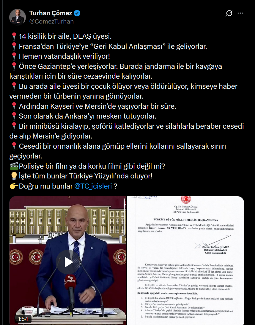 İlk önergesinde AŞTİ’de nakliyeci olarak çalışan Binali Aslan’ı öldürerek Hatay üzerinden Suriye’ye kaçan ve MİT operasyonuyla yakalanan 14 kişilik aileyi gündeme getirdi. Ailenin Fransa’dan geldiği, Türkiye’de çeşitli illerde ikamet ettiği ve IŞİD bağlantılı olduğunun belirlendiğini anımsatan Çömez, şu sorulara yanıt istedi: