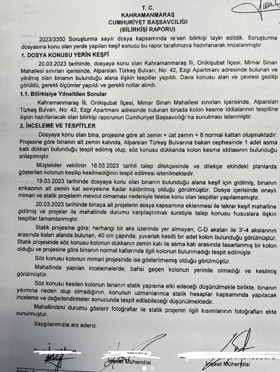 Kahramanmaraş Cumhuriyet Başsavcılığı’nca başlatılan soruşturma kapsamında Mimar İbrahim Yiğiter, İnşaat Mühendisi Erdi Kavaklı ve İnşaat Mühendisi Mehmet Celalettin Somuncuoğlu bilirkişi olarak tayin edildi. Detaylı inceleme yapan bilirkişi, zemin katta kolon kesildiğini tespit edip hazırladığı raporu Kahramanmaraş Cumhuriyet Başsavcılığı’na sundu.