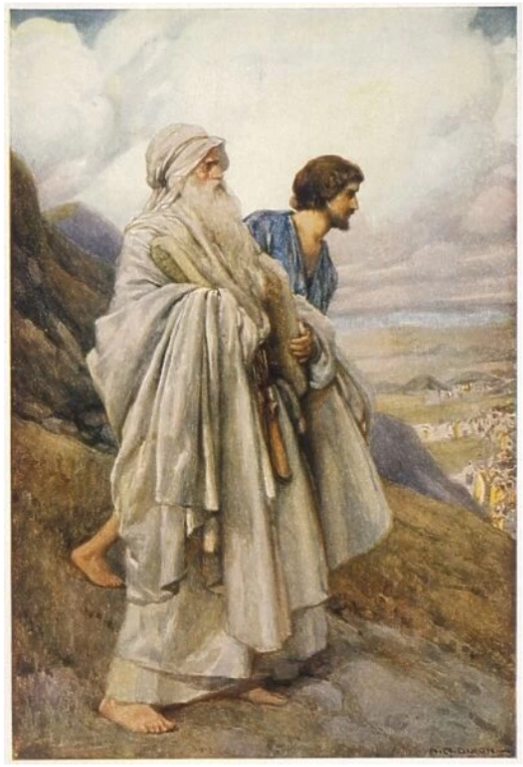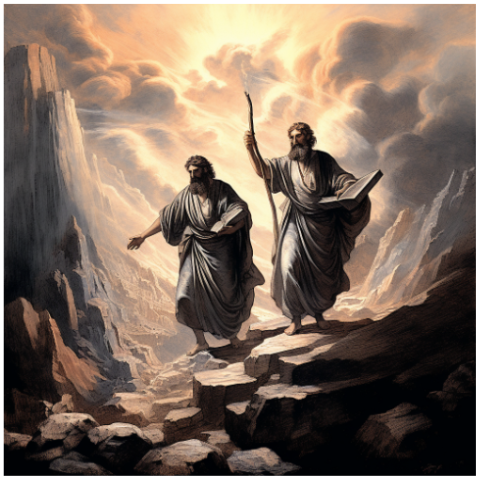 Musa ve Yeşu, Sina’dan beraber iniyorlar. Musa’nın elinde “on emir” tableti.
