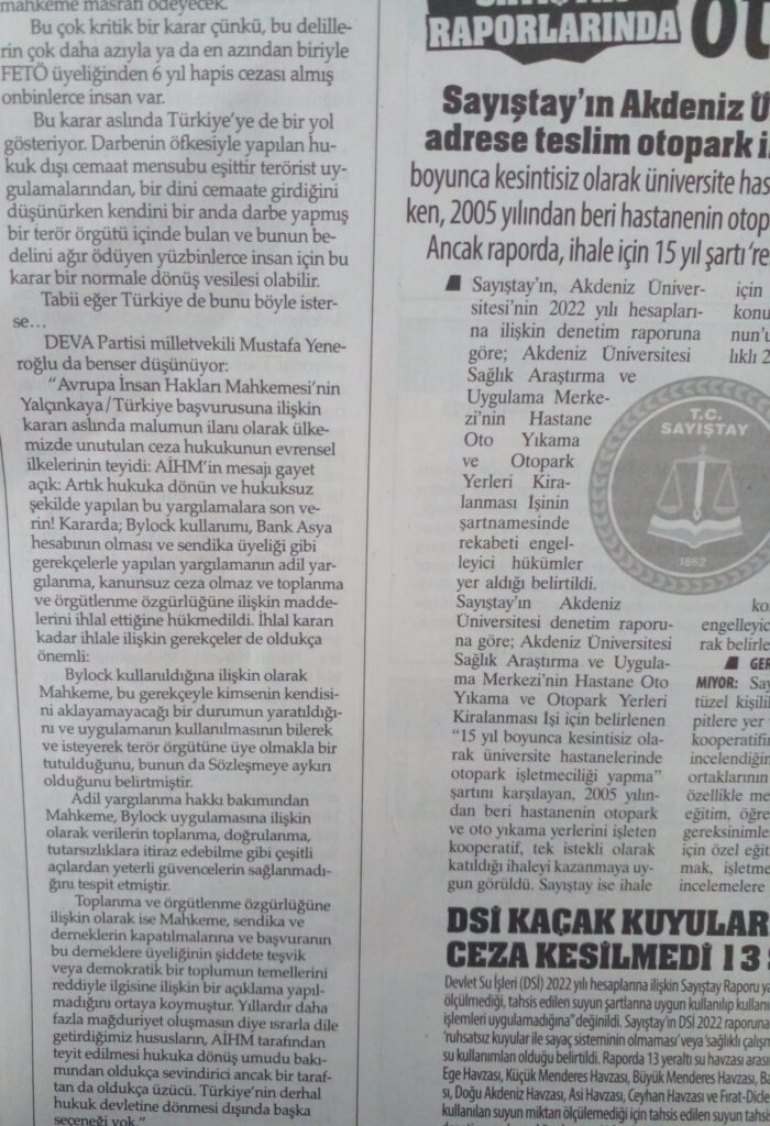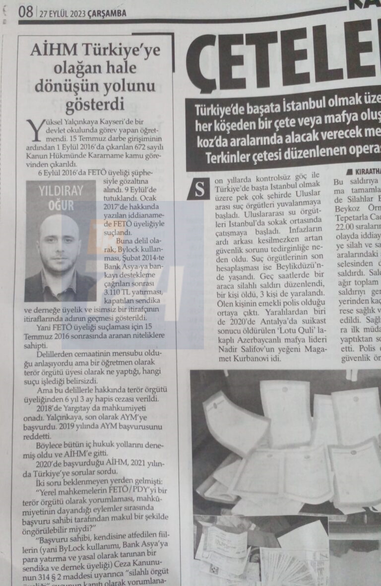 Avrupa İnsan Hakları Mahkemesi’nin (AİHM) Yüksel Yalçınkaya/Türkiye davasında kritik bir karara imza attığına dikkat çeken gazeteci Yıldıray Oğur, ”Bu karar aslında Türkiye’ye de bir yol gösteriyor. Darbenin öfkesiyle yapılan hukuk dışı cemaat mensubu eşittir terörist uygulamalarından, bir dini cemaate girdiğini düşünürken kendini bir anda darbe yapmış bir terör örgütü içinde bulan ve bunun bedelini ağır ödeyen yüz binlerce insan için bu karar bir normale dönüş vesilesi olabilir.” dedi.