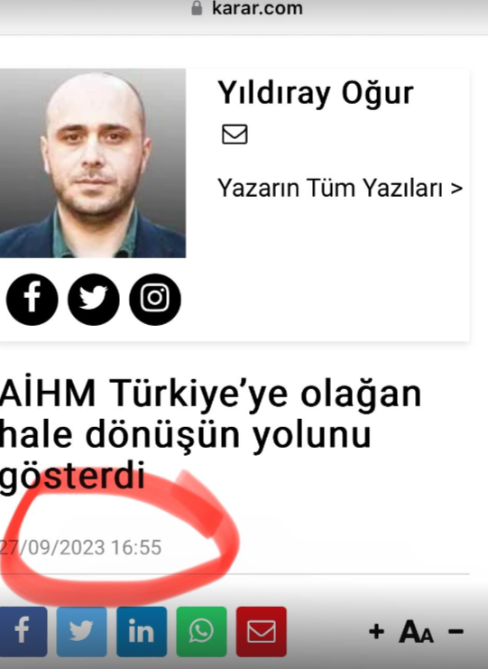 TR724’ün Karar gazetesinin Yıldıray Oğur’un ‘AİHM, Türkiye’ye dönüşün yolu gösterdi’ yazısına sansür uyguladığı ve internet sitesinde yer vermediği yönünde haberinin ardından Karar gazetesi Yıldıray Oğur’un köşe yazısını saat 16.55’te internet sayfasında yayınlanması dikkat çekti.
