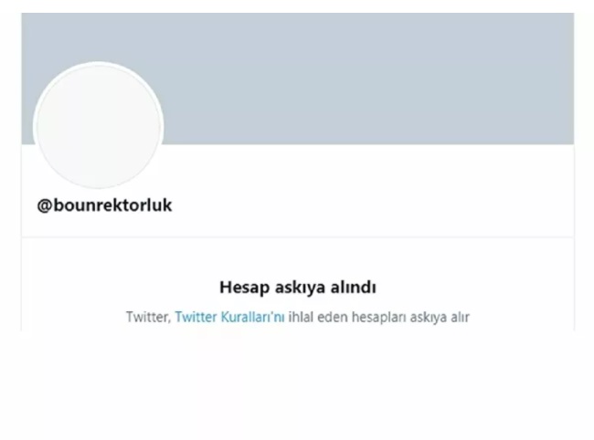 Boğaziçi Üniversitesi Rektörlüğü’nün Twitter hesabı askıya alındığı fark edildi. Üniversitenin rektörlüğüne ait Twitter adresine girmek isteyen sosyal medya kullanıcıları, hesabın askıya alındığını gördü.