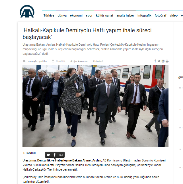 20 Nisan 2018’de AB heyetiyle yapılan toplantıda konuşan Arslan, AB hibe programıyla gerçekleştirilecek Halkalı-Kapıkule Demiryolu Hattı Projesi Çerkezköy-Kapıkule Kesimi İnşası’na ilişkin, “Bu projenin müşavirliği ile ilgili ihale süreçleri başladı. Yakın zamanda yapım ihalesiyle ilgili süreçleri başlatmış olacağız. Bu diyalogların sonunda geldiğimiz en önemli noktalardan biri.” diye konuşmuştu.
