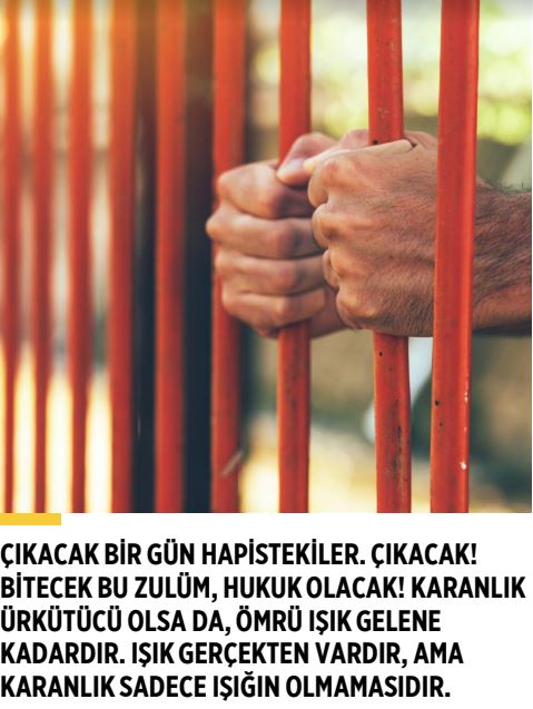 Çıkacak bir gün hapistekiler. Çıkacak! Bitecek bu zulüm, hukuk olacak! Karanlık ürkütücü olsa da, ömrü ışık gelene kadardır. Işık gerçekten vardır, ama karanlık sadece ışığın olmamasıdır. İftiradan korkma sakın, gerçeği güçsüz sanıp. Işık ve gerçek kardeştir. Biri karanlığı boğar, diğeri iftirayı. Yıkılan binalar onarılamasa da, yerine yenileri yapılacak. Kapatılan üniversiteler yıllarını geri alamasa da, bir gün yine öğrenciyle dolup taşacak. Çöreklenilen televizyonlar, gazeteler bugün sussa da, bir gün gerçekleri anlatacak. Zindanlarda ağlayanlar olsa da bugün, ağlatanları kimse unutmayacak. İşini aşını kaybedenler, geri döndüklerinde, onları işsiz aşsız bırakanlar işini aşını kaybedecek. Yaşananları unutmayacağımız gibi, bunları bize yaşatanları da tarih unutmayacak.