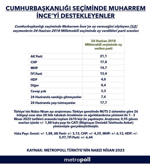 Metropoll Araştırma, Nisan ayı kamuoyu araştırma raporu önemli bilgiler içeriyor. İnce’ye hangi partilerden oy gittiğine ilişkin bir araştırma bu.