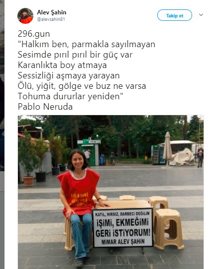 OHAL döneminde çıkarılan KHK ile ihraç edildiği mesleğine iade talebiyle 30 Ocak 2017’den beri Düzce’de eylemde olan Mimar Alev Şahin 297 gündür hak arama mücadelesine devam ediyor.