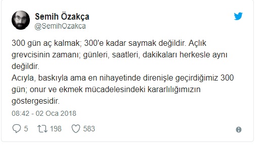 Açlık grevinin 300. günü dolayısıyla sosyal medyadan bir paylaşımda bulunan Semih Özakça, “300 gün aç kalmak; 300’e kadar saymak değildir. Açlık grevcisinin zamanı; günleri, saatleri, dakikaları herkesle aynı değildir. Acıyla, baskıyla ama en nihayetinde direnişle geçirdiğimiz 300 gün; onur ve ekmek mücadelesindeki kararlılığımızın göstergesidir” dedi.