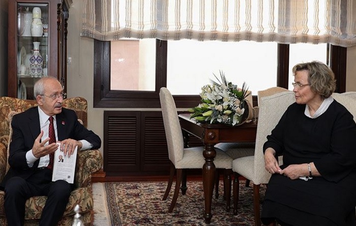 CHP Genel Başkanı Kemal Kılıçdaroğlu, MHP’nin kurucusu ve ilk genel başkanı Alparslan Türkeş’in eşi Seval Türkeş’i İstanbul’daki ziyaret etti. Kılıçdaroğlu, Türkeş’e seçme yazıları ve konuşmalarından derlenen ‘Özgür ve Adil Bir Türkiye İçin Yürüyüş’ kitabını hediye etti.
