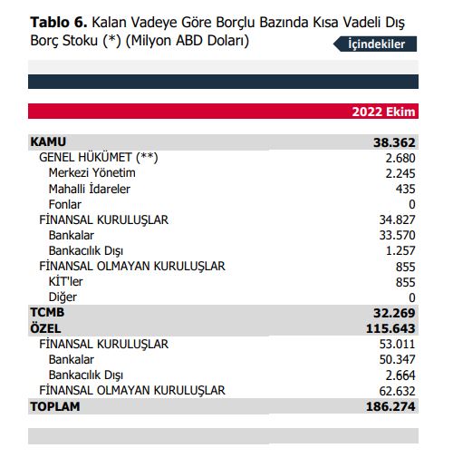 Ekim sonu itibarıyla, kısa vadeli dış borç stoku, 2021 yıl sonuna göre yüzde 17,1 artışla 142,3 milyar dolara yükseldi. Bu dönemde, bankalar kaynaklı kısa vadeli dış borç stoku yüzde 13,4 oranında artarak 58,3 milyar doları olurken, diğer sektörlerin kısa vadeli dış borç stoku yüzde 17,4 oranında artarak 51,8 milyar dolar oldu.