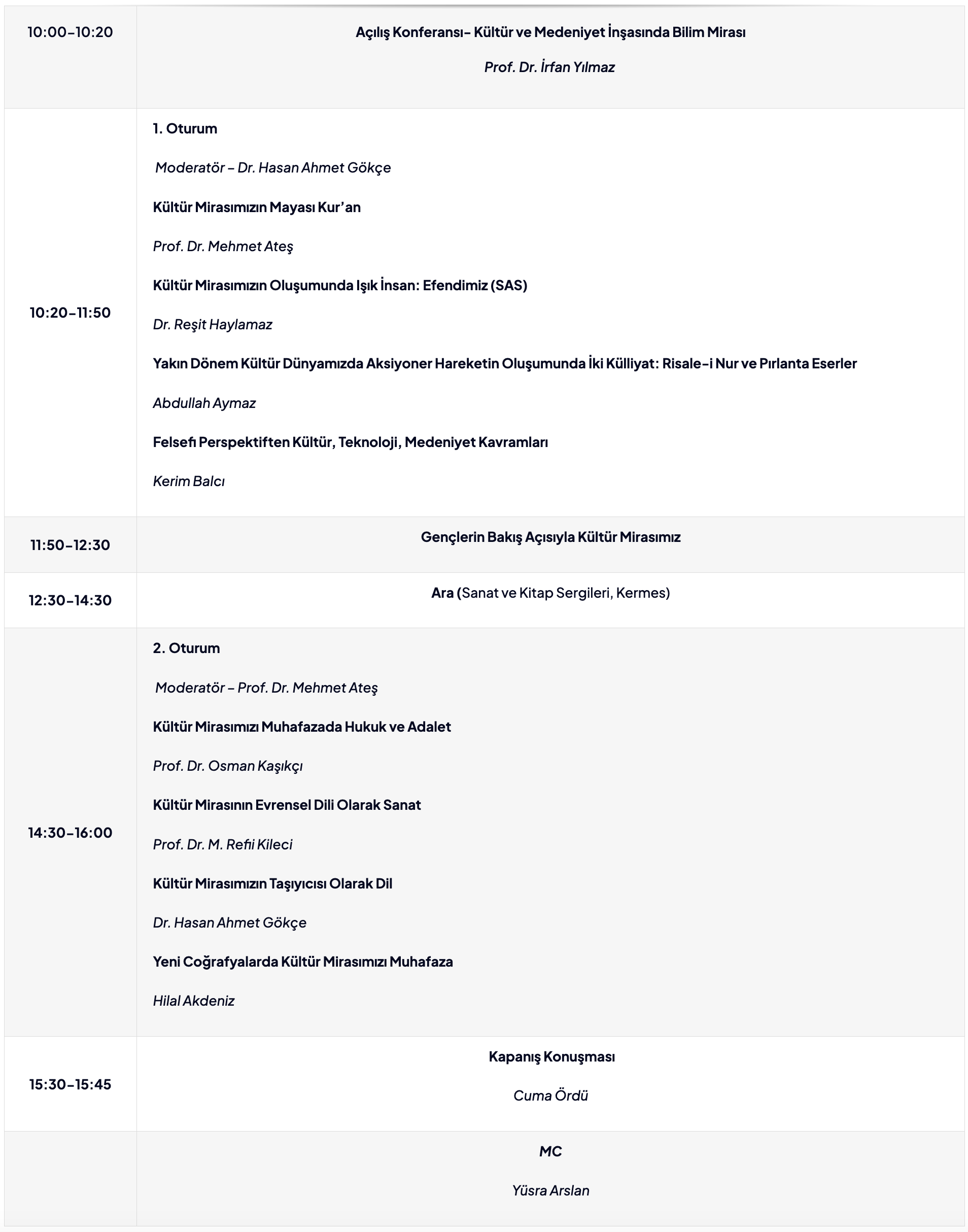 Sempozyumda Abdullah Aymaz, Prof. Dr. İrfan Yılmaz, Kerim Balcı, Dr. Reşit Haylamaz, Dr. Hasan Ahmet Gökçe, Prof. Dr. Refii Kileci, Hilal Akdeniz, Osman Kaşıkçı, Zeynep Sena Sayın ve Rana Özçelik konuyla ilgili bildirimlerini sunacaklar. Sunumlarda, kültür, teknoloji ve medeniyet kavramları, Kur’an-ı Kerim ve Peygamber Efendimiz’in (sav) kültür mirasımızdaki yeri, hukuk ve adaletin kültür mirasıyla ilişkisi, yayıncılık tarihimiz, dilimiz ve sanatlarımızın bu miras üzerindeki etkisi ve yeni coğrafyalarda bu mirasın korunması gibi konular, uzmanlar tarafından ele alınacak.