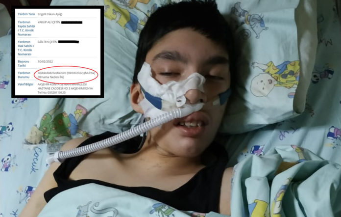 Kanun Hükmünde Kararname (KHK) ile ihraç edilen öğretmen Eyüp Çetin’in eşi Gülten Çetin’in yüzde 98 engelli olan oğlu Yakup Ali Çetin için başvurduğu engelli yakını aylığı reddedildi. Konya Akşehir Kaymakamlığı Sosyal Yardımlaşma Vakfı, başvurunun neden reddedildiğine ilişkin gerekçe sunmazken, aile ise KHK’lı olmalarından dolayı başvurularının reddedildiğini söyledi.