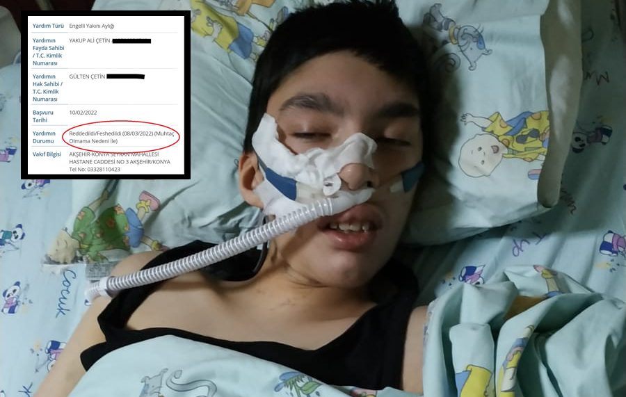 16 yaşındaki Yakup Ali Çetin, dokuz ay içerisinde dört kez yoğun bakımda tedavi gördü. Yüzde 98 engelli olan Çetin’e, otizm, dirençli epilepsi, kas hipotenisi, kronik akciğer hastalığı ve yutma güçlüğü tanıları konuldu. Oğlunun sağlık durumunun gün geçtikçe kötüye gittiğini söyleyen Gülten Çetin, oğluyla ilgili şunları söyledi: “Yakup’un günlük posteral drenaj, aspirasyon, mama ilaç fizik ve benzeri ihtiyaçlarının karşılanması ve bunların hiçbir şekilde ihmal edilmemesi gerekiyor. Yakup’un sağlıklı hayata devam edebilmesi için bunlar şart fakat Yakup’un iki küçük kardeşi daha var. Onların da yaşı gereği bakıma ve ilgiye ihtiyacı var. Ben tek başıma tüm bunlara artık yetişemiyorum.”