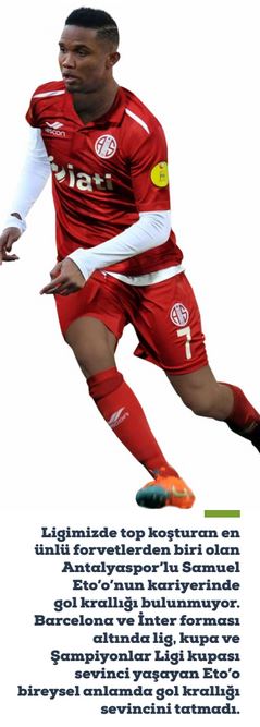 Ligimizde top koşturan en ünlü forvetlerden biri olan Antalyaspor’lu Samuel Eto’o’nun kariyerinde gol krallığı bulunmuyor. Barcelona ve İnter forması altında lig, kupa ve Şampiyonlar Ligi kupası sevinci yaşayan Eto’o bireysel anlamda gol krallığı sevincini tatmadı. Eto’o kariyerindeki tek krallığı 2010-11 sezonunda Coppa İtalia (İtalya Kupası) gol krallığı ile yaşadı.
