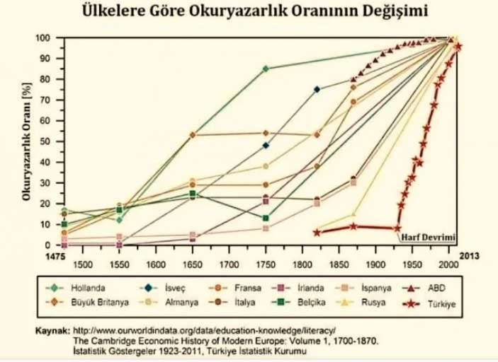 Osmanlı’da okuma yazma oranı neydi? Bunun alfabeyle ilgisi var mıydı? Bunların ikisi de çok tartışmalı konular. Ancak aklı başında hiç kimse bu tarz yıkıcı bir geçişi onaylayamaz. Burada yazarın verdiği istatistikler doğruysa Osmanlı’da 1894’de % 50’nin üzerinde bir okur-yazarlık söz konusu ki bu pek mümkün görünmüyor. Bu konuda Yüksel Nizamoğlu’nun yazısına bakılabilir: https://www.tr724.com/osmanli-toplumu-okuryazar-miydi/. Orada verilen rakamlara göre 20. yy başında bu oran % 20-30 arasındadır. Cihan Harbi ve Kurtuluş Savaşında bu oranın düşmesi gayet normaldir, ayrıca daha eğitimli olan gayr-i müslim ahalinin de ayrılması bu oranı düşürmüş olabilir.