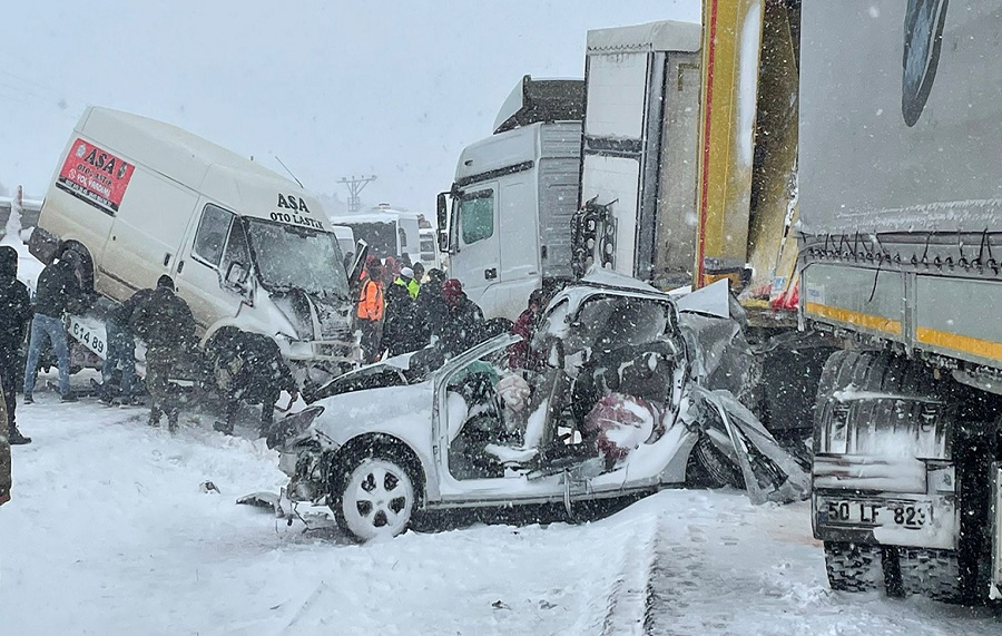 Mardin’de yoğun kar yağışı nedeniyle meydana gelen zincirleme trafik kazasında 5 TIR, 1 yolcu otobüsü, ticari araç ve 2 otomobil birbirine girdi. İlk belirlemelere göre 3 kişi öldü, 10 kişi yaralandı.