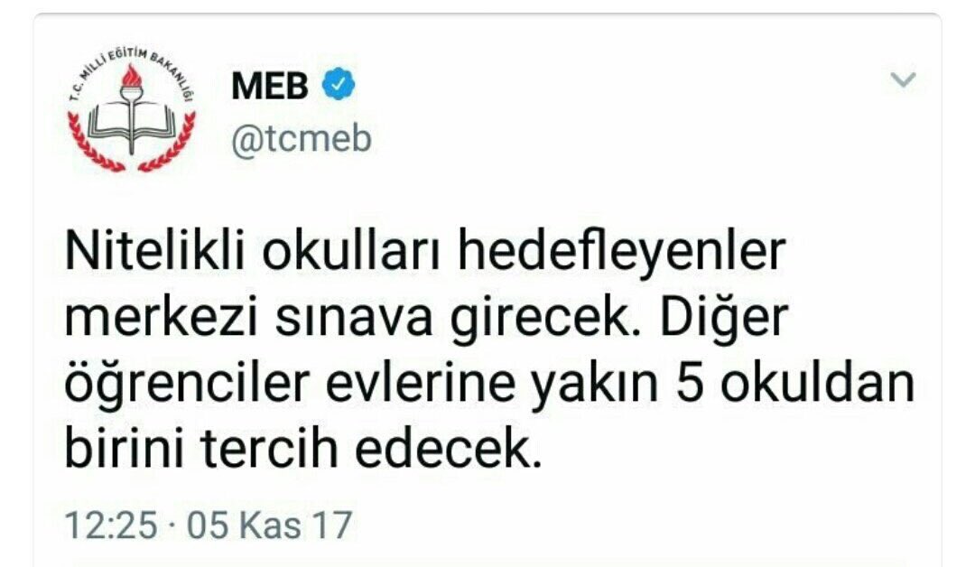 TEOG’un yerine getirilen “Eğitim Bölgesi ve Sınavsız Mahalli Yerleştirme Sistemi”ninde öğrencilerin yüzde 10’un gireceği okulları için twitter hesabında, ‘nitelikli okul’ ifadesi kullanan MEB, bu twitini gelen tepkiler üzerine sildi. Twitte, “Nitelikli okulları hedefleyenler merkezi sınava girecek. Diğer öğrenciler evlerine yakın 5 okuldan birini tercih edecek.” diyen MEB’in açıklaması, kısa sürede kamuoyunnda diğer kalan okulların niteliksiz olduğunu tartışmaya açmıştı.