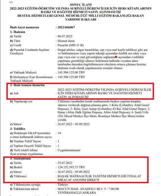 “Milli Eğitim Bakanlığı, 06.07.2022 tarihinde, 2002/666067 ihale kayıt numaralı, “2022-2023 Eğitim-Öğretim yılında Suriyeli öğrenciler için ders kitaplarının baskı ve dağıtım satın alınması işi” adı altında Kamu İhale Kanunu’nun 21/b maddesi kapsamında ihale yapmıştır. İhaleyi daha önce Milli Eğitim Bakanlığı’ndan defalarca ihale almış olan Başak Matbaacılık Hizmetleri İthalat İhracat A. Ş. 124 milyon 152 bin 593 TL bedelle almıştır.