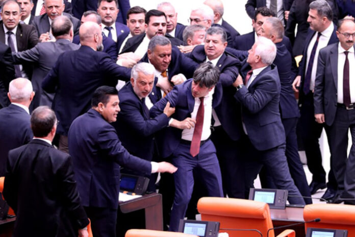 TBMM Genel Kurulu’nda DEM Parti Mersin Milletvekili Ali Bozan ve AKP’li milletvekilleri arasında “hırsızlık” atışmasıyla başlayan tartışma, yumruk ve tekmeli kavgaya dönüştü. Eski Ulaştırma Bakanı Adil Karaismailoğlu, Genel Kurul’da AKP’ye “Hırsız!” diyen DEM Partili Ali Bozan’a tokat attı…
