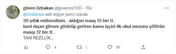 “30 yıllık mühendisim. Aldığım maaş 15 bin TL. Beni dışarı göreve götürüp getiren kamu işçisi ilkokul mezunu şoförün maaşı 12 bin TL.”