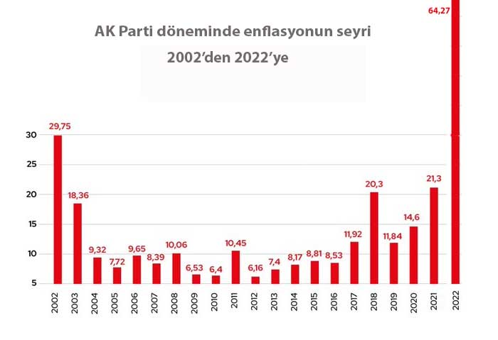 AK Parti’nin iktidara gelmesiyle attığı başarılı adımlardan birisi enflasyon alanında oldu. Yüzde 29,75’ten aldığı enflasyonu iki yıl içerisinde tek haneli rakamlara indirdi. Küresel krizin etkilerini sürdürdüğü dönem hariç, 2016’ya kadar hep tek haneli olarak seyretti.