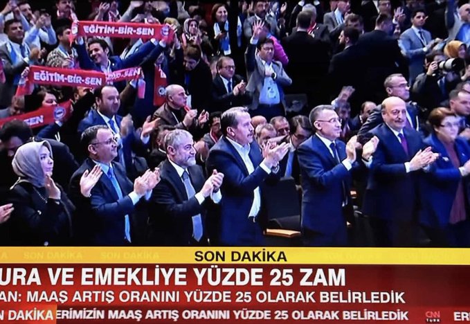 Cumhurbaşkanı Erdoğan, memura ve emekliye yapılacak zammı yüzde 25 olarak duyurdu. Erdoğan bu “müjdesini” Memur Sendikaları Konfederasyonu (Memur-Sen) toplantısında açıkladı. Memur-Sen Genel Başkanı Ali Yalçın, yüzde 25’lik zam açıklamasını ayakta alkışladı.