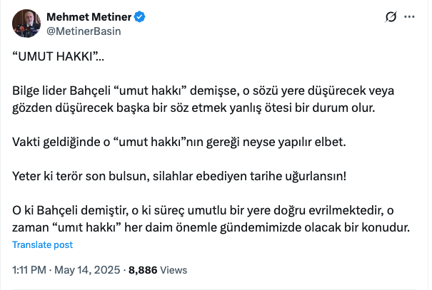 Mehmet Metiner, sosyal medya hesabından ‘UMUT HAKKI’ başlığıyla yaptığı paylaşımda şu ifadeleri kullandı: