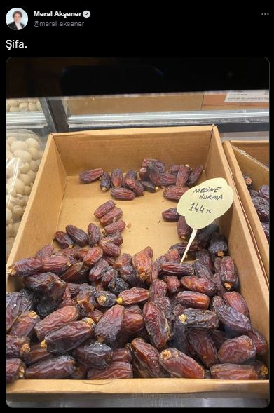 AKP’li Cumhurbaşkanı Recep Tayyip Erdoğan’ın ‘şifa’ kürü gündem olmaya devam ediyor. Son olarak İYİ Parti Genel Başkanı Meral Akşener, Erdoğan’ın küründe yer alan Medine hurmasının fotoğrafını paylaştı. Akşener’in sosyal medya hesabından yaptığı paylaşımda Medine Hurması’nın kilosu 144 lira olarak görülüyor. Akşener, fotoğrafa ‘Şifa’ notu düştü.