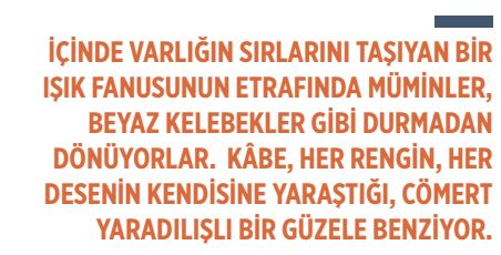 Önce Kâbe’nin ışıl ışıl minareleri görünüyor. Sonra, etrafını genişleyen çemberler halinde çevreleyen beyaz mermerler…