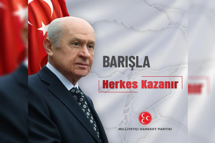 MHP sosyal medya hesabından yapılan paylaşım dikkat çekti. MHP Genel Başkanı Devlet Bahçeli’nin fotoğrafıyla yapılan paylaşımda “Barışla herkes kazanır” denildi.
