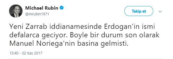 Türkiye uzmanı eski Pentagon yetkilisi ve yazar Michael Rubin, ABD’de tutuklu olan ve itirafçı olduğu belirtilen Rıza Zarrab’ın yeni iddianamesiyle ilgili ilginç bir açıklama yaptı. Rubin twitter hesabından, “Yeni Zarrab iddianamesinde Erdoğan’in ismi defalarca geçiyor. Böyle bir durum son olarak Manuel Noriega’nin başına gelmisti.” dedi.